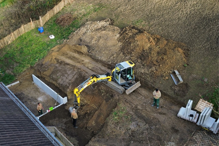 Im Mittelpunkt des Projekts steht der Einbau massiver Winkelstützen, die dem Gelände langfristig sicheren Halt geben und gleichzeitig eine klare Gliederung ermöglichen. Bevor diese ihren endgültigen Platz erhalten, gehen den Arbeiten umfangreiche Erd- und Vorbereitungsmaßnahmen voraus: Der Boden wird fachgerecht vorbereitet, Höhen exakt angepasst und alle Flächen sauber auf Maß gebracht.