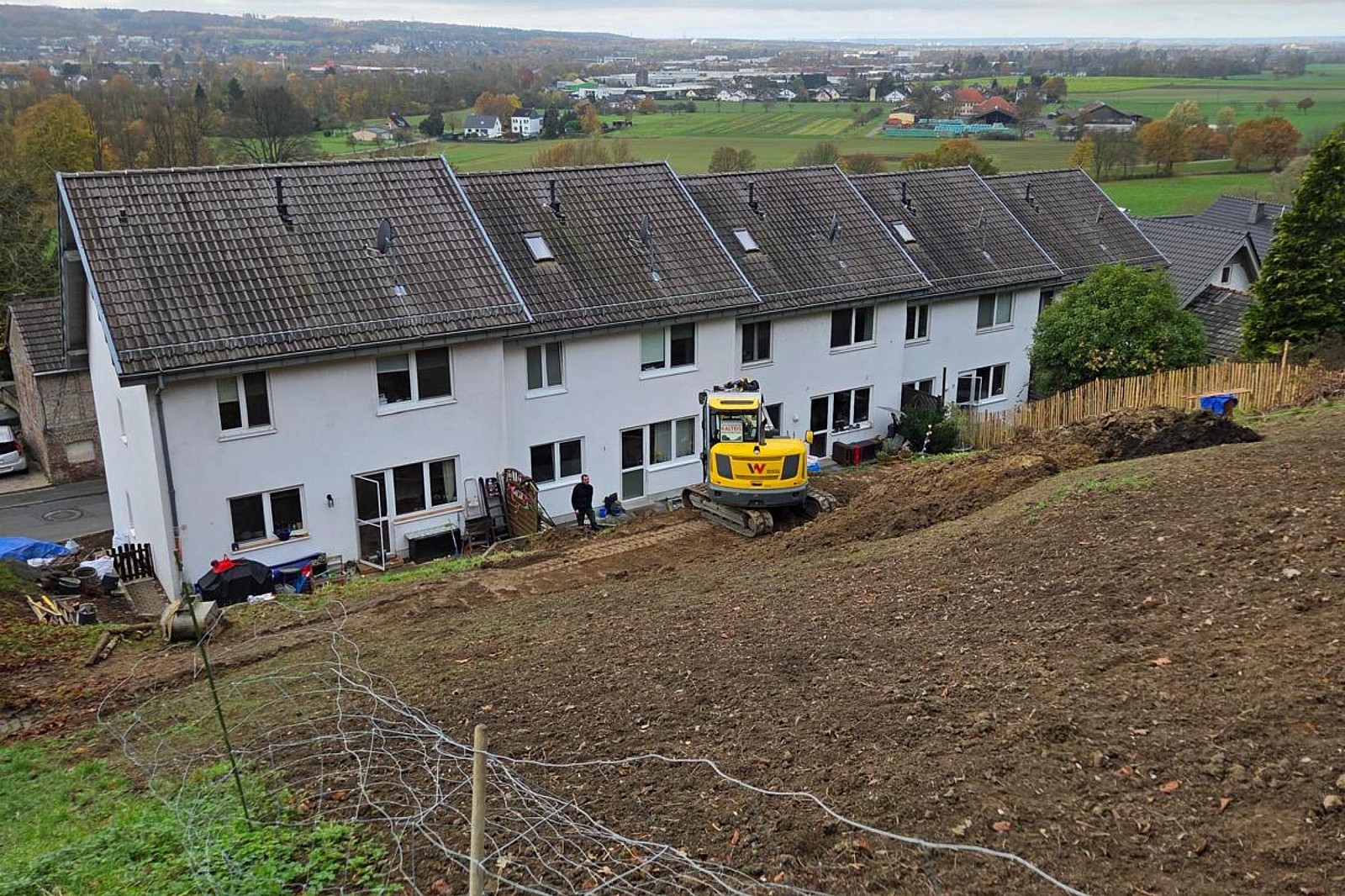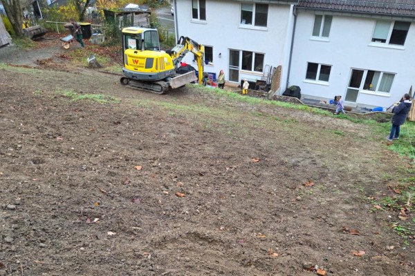 Auf unserer Baustelle in Hennef wird aus starkem Gefälle nach und nach ein strukturierter Gartenraum. Wo zuvor unruhige Höhenunterschiede dominierten, entstehen klare Ebenen mit stabilen Übergängen. Bereits während der Bauphase zeigt sich, wie entscheidend eine saubere Planung und eine präzise Ausführung bei Arbeiten in Hanglage sind. Ziel des Projekts ist es, dem Gelände Halt, Ordnung und eine langfristig nutzbare Struktur zu geben.