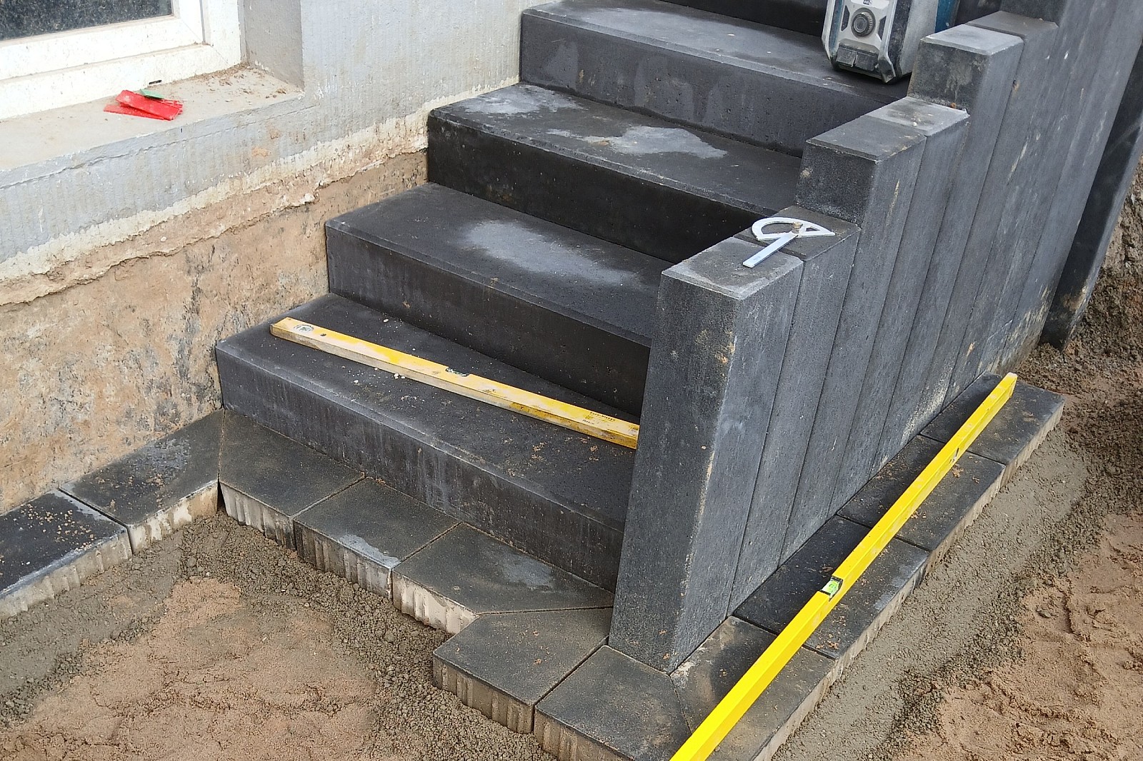 Zentrales Element bilden die 80×40 cm großen L-Steine von KANN, geliefert durch Mobau Klein. Sie strukturieren das Gelände neu und schaffen die Basis für eine spätere Keramikterrasse. Alle Knickpunkte wurden mit präzisen Gehrungsschnitten ausgeführt, sodass ein ruhiges, durchgehendes Bild entsteht.