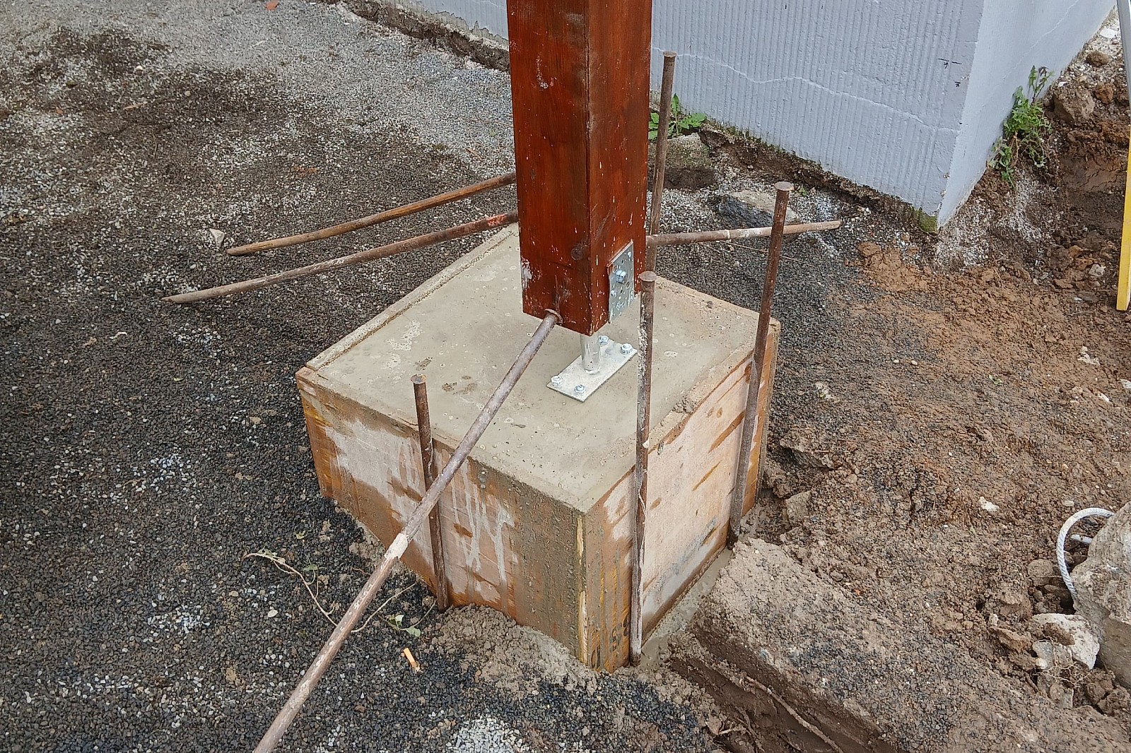 Parallel entstand das Fundament für eine Pergola, passgenau in den Hang eingebettet. Ergänzt wird die Anlage durch Blockstufen und 150 cm hohe Palisaden der La-Tierra-Serie sowie klar definierende Kantensteine. Das Multitec-Aqua-Pflaster bildet den funktionalen Abschluss – eine robuste Fläche, rund 45 cm höher als zuvor, die künftig als Fahrrad- und Mülltonnenplatz dient.