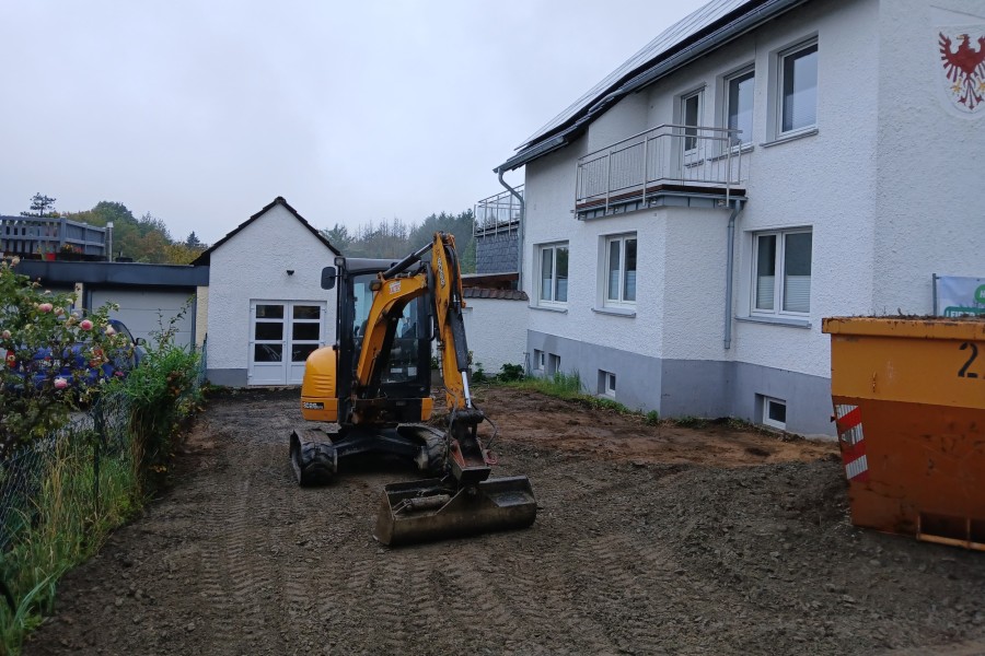 Zu Beginn wurden die bestehenden Pflanzflächen gerodet. Eibe, Haselnuss und Cotoneaster machten Platz für die neue Gestaltung. Der anschließende Bodenaushub – erschwert durch die Hanglage und Betonschutt im Erdreich – legte die Grundlage für eine stabile Ausführung.