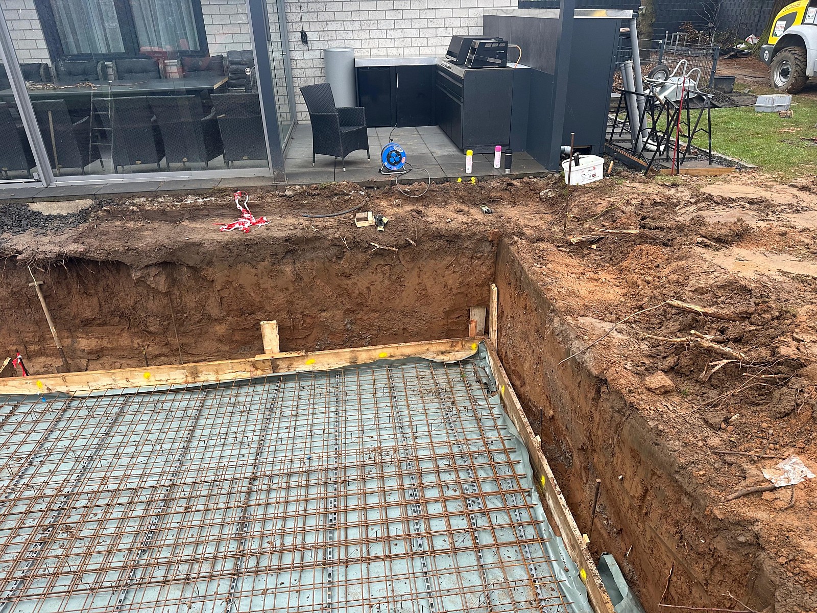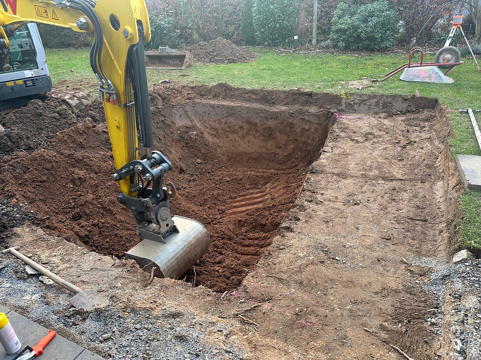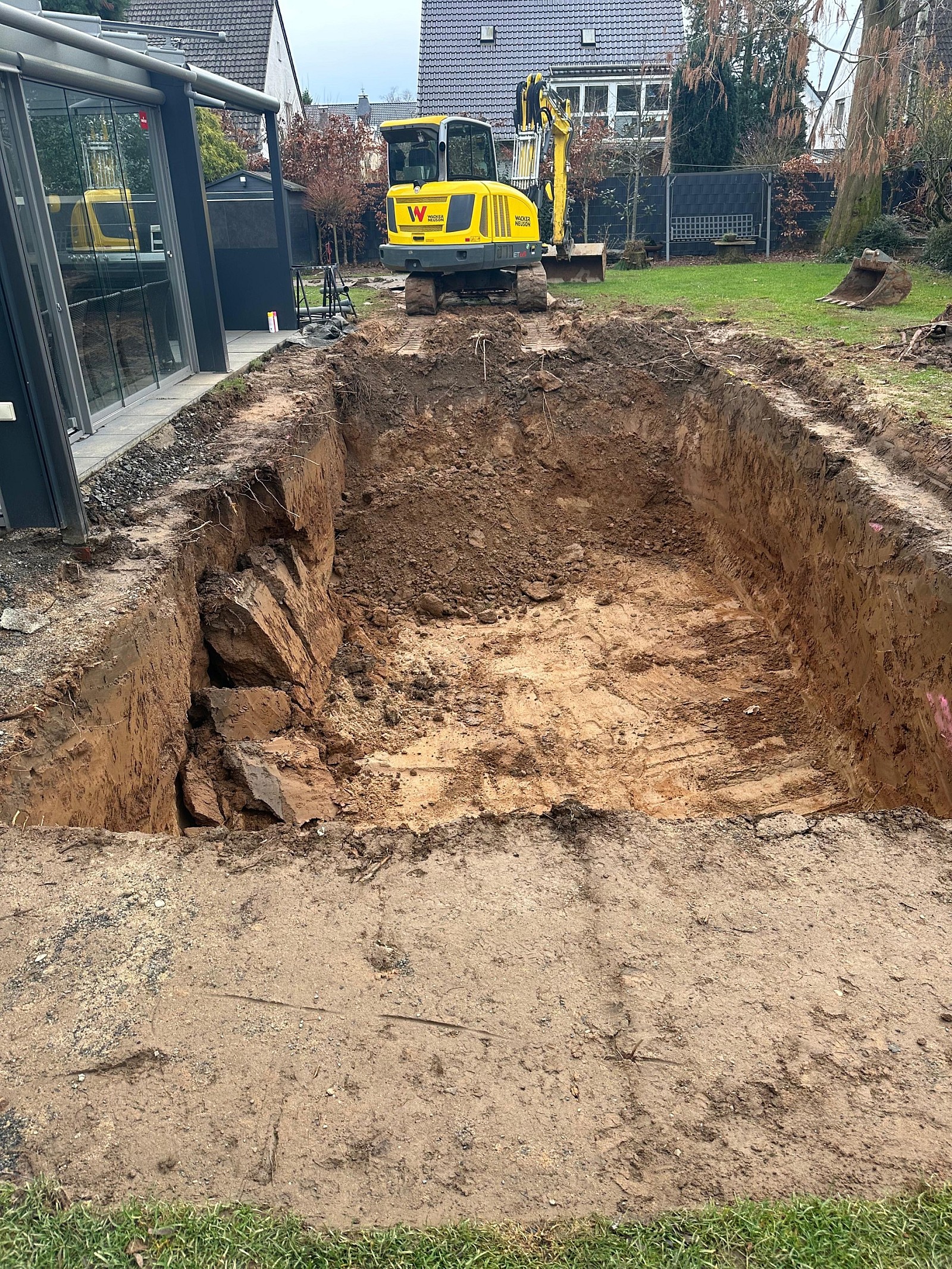 Unsere Baustelle in Köln Porz Eil nimmt mehr und mehr Form an und es ist wirklich beeindruckend zu sehen, wie alles voranschreitet! Die Baugrube in Köln Porz Eil ist bereits in voller Größe ausgehoben und schafft Platz für ein wahres Highlight: Ein Pool mit großzügigen Maßen von 8x4 Metern wird hier entstehen. Dieses Projekt wird ein absoluter Blickfang!