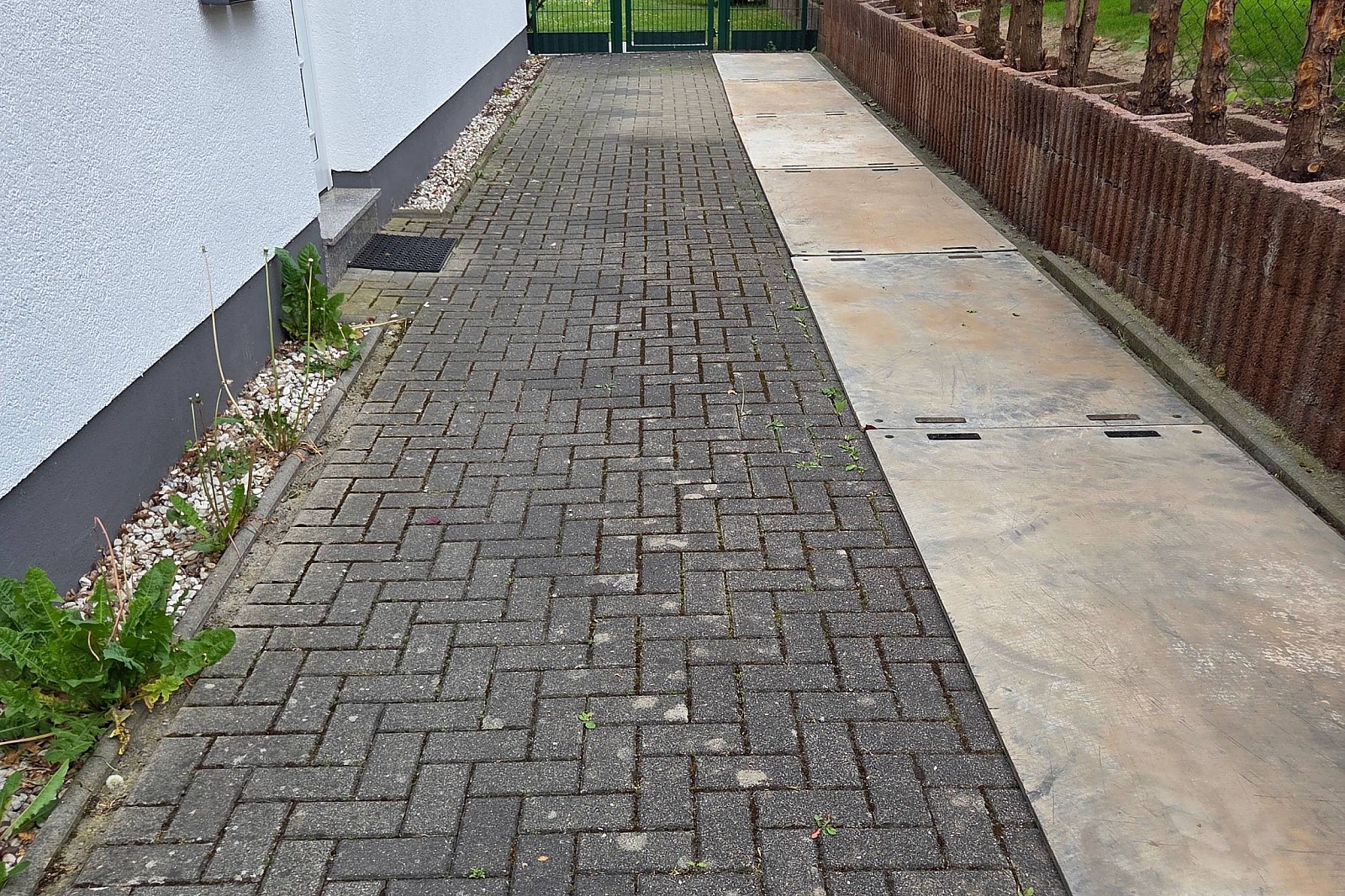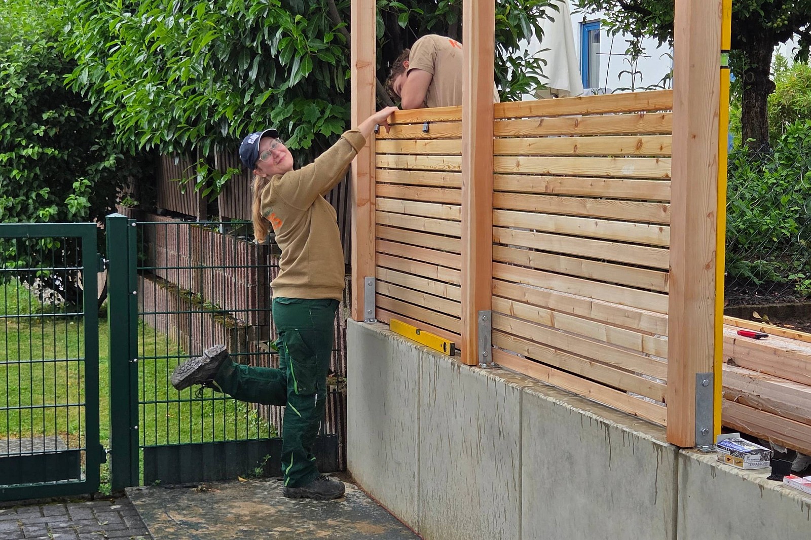 Neben der funktionalen Sicherung durch Mauerscheiben spielt auch der Sichtschutz eine wichtige Rolle. Auf dem Bonner Grundstück wurde ein hochwertiger Holzzaun aus Rhombusleisten installiert. Diese moderne und langlebige Lösung fügt sich perfekt in die Umgebung ein, bietet zuverlässigen Sichtschutz und ergänzt die Mauerscheiben optisch.