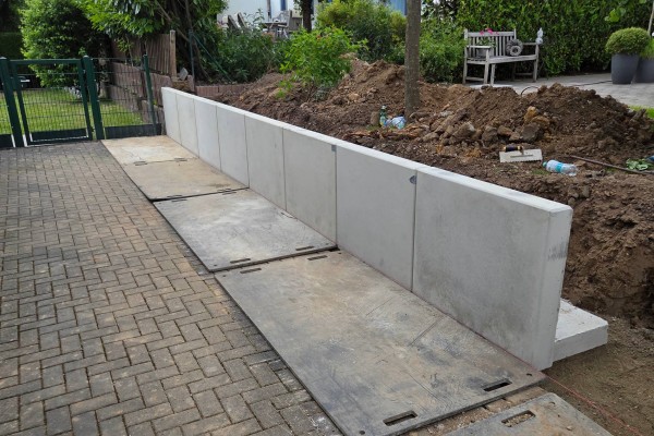 Auf der Baustelle in Bonn kamen hochwertige Mauerscheiben der Firma KANN Baustoffwerke zum Einsatz. Diese Bauelemente bestehen aus robustem Beton, sind langlebig und speziell für die Aufnahme hoher seitlicher Erddrücke konstruiert. Neben der funktionalen Sicherung des Geländes tragen sie maßgeblich zur klaren Linienführung bei.