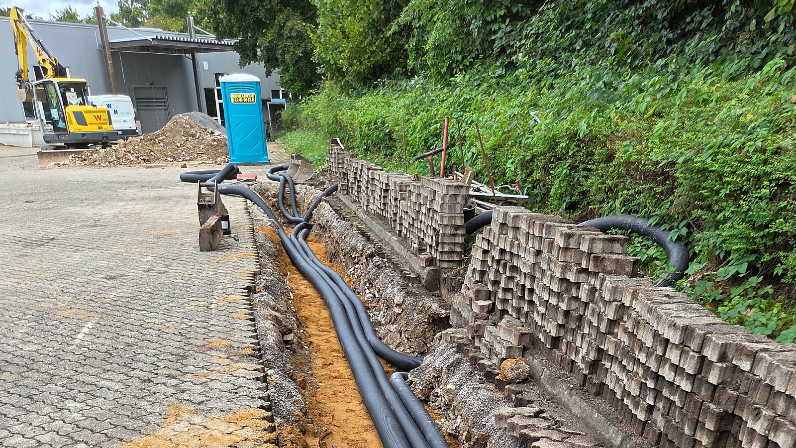 Zentrale Aufgabe war der präzise Aushub und Bau neuer Leitungsgräben für die Strom- und Datenversorgung moderner Postautoladestationen. Dabei wurden Pflasterflächen geöffnet, Kabelschutzrohre verlegt und die Oberflächen anschließend fachgerecht wiederhergestellt. Auch das Thema Nachhaltigkeit spielte eine wichtige Rolle: Neue Bäume und Grünflächen sorgen für ein ausgewogenes Gesamtbild und verbessern das Mikroklima vor Ort.